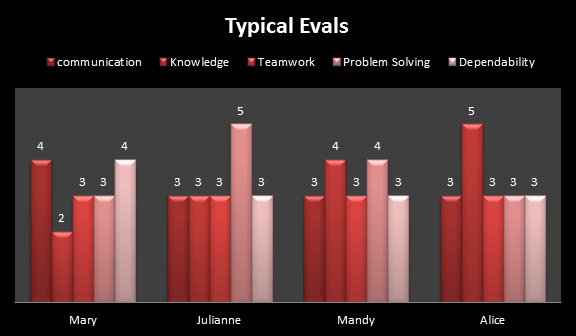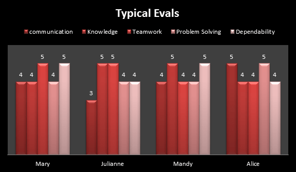 Here is the same chart with more realistic numbers. Everyone is meeting performance standards except Mary who made too many withdrawals from the knowledge bank. Every employee is above average in at least one area.